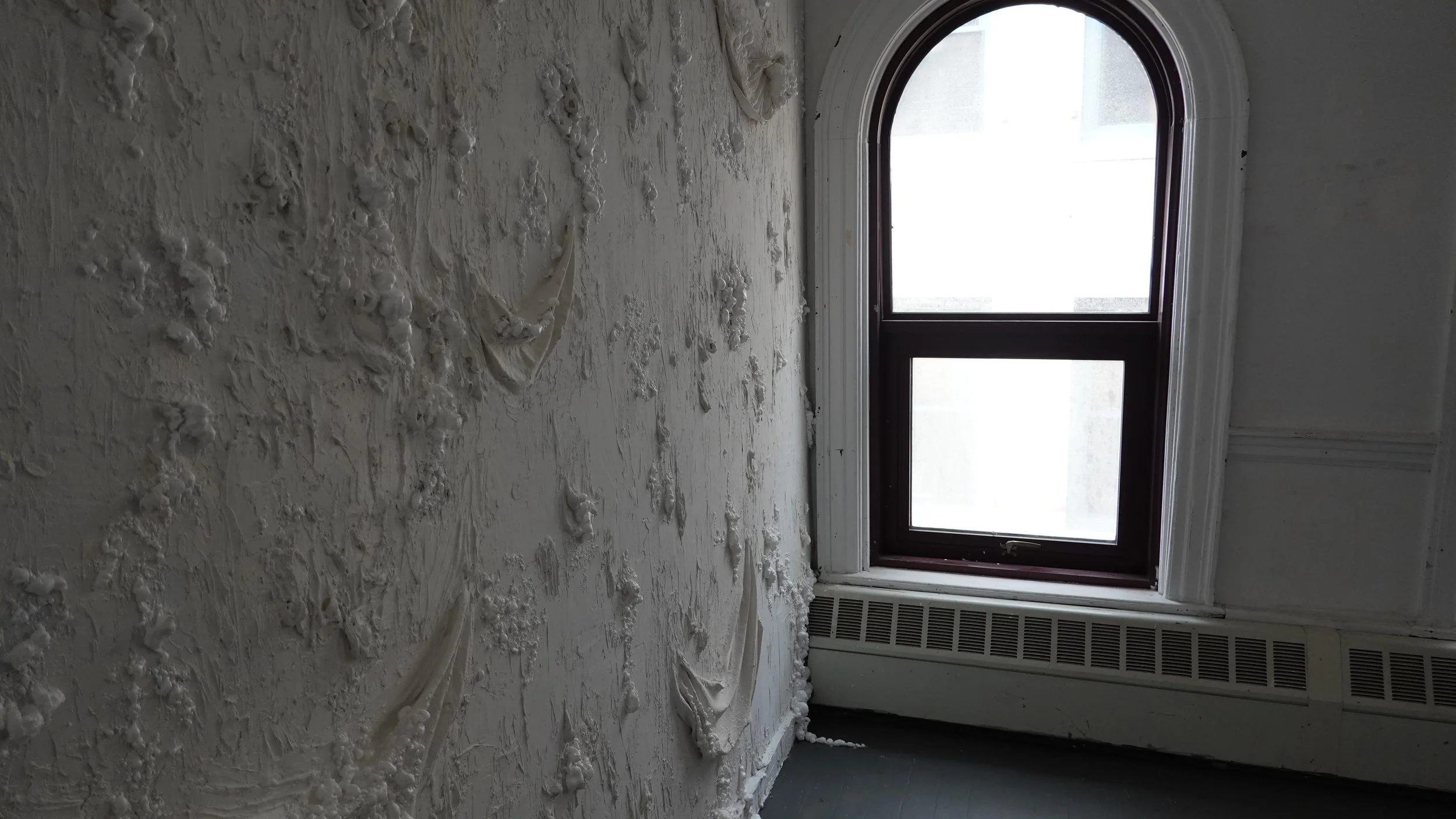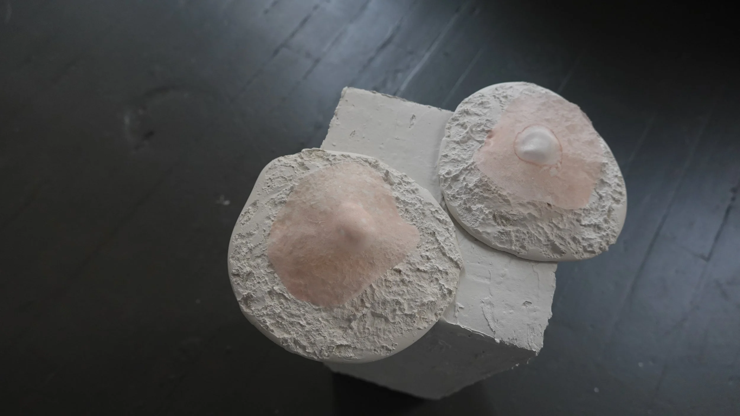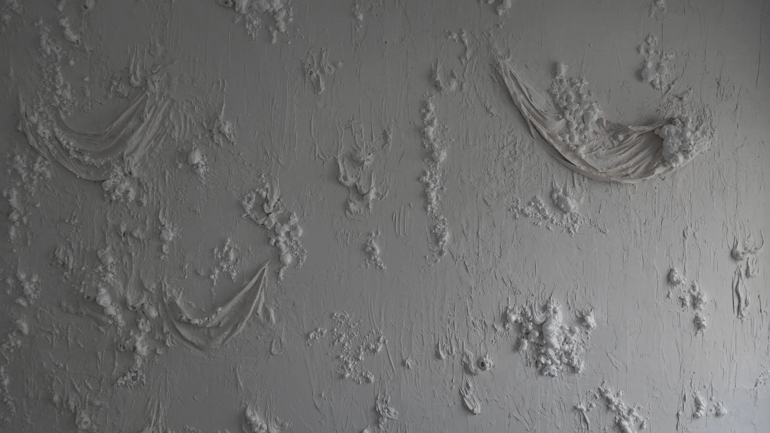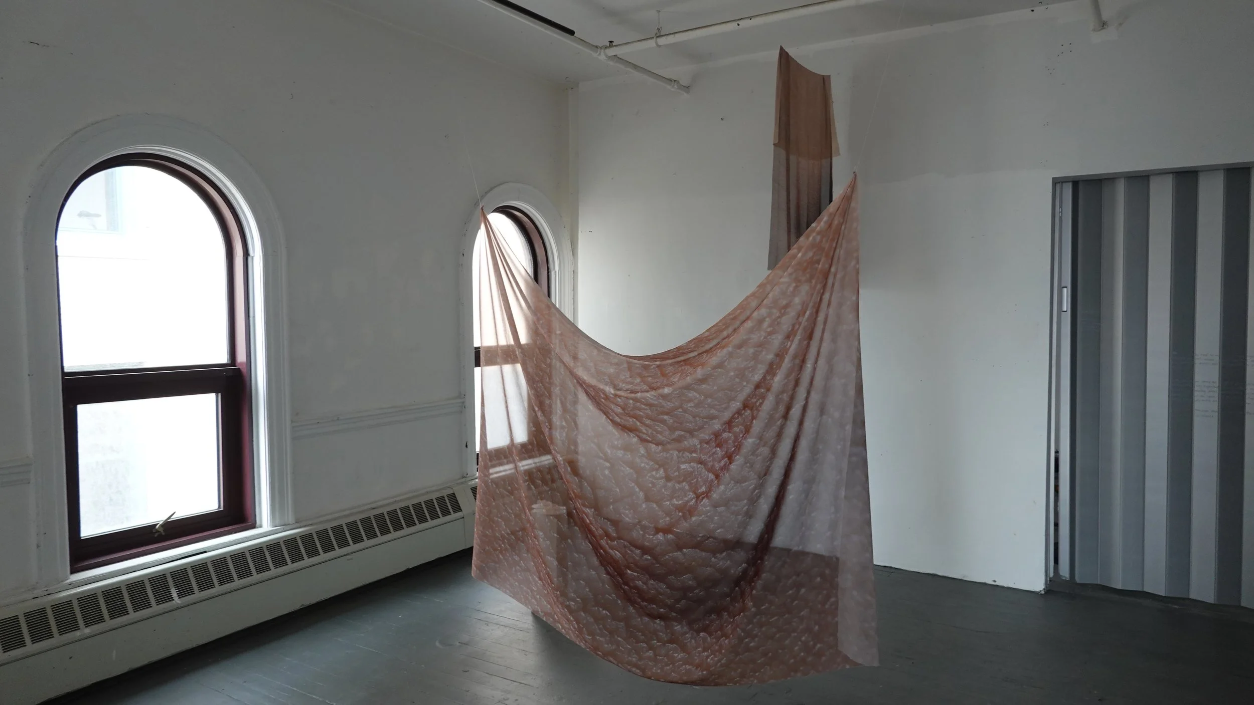 Untitled I, 2021, joint compound, plaster, polyester, foam, photo printed on silk georgette, dimensions variable